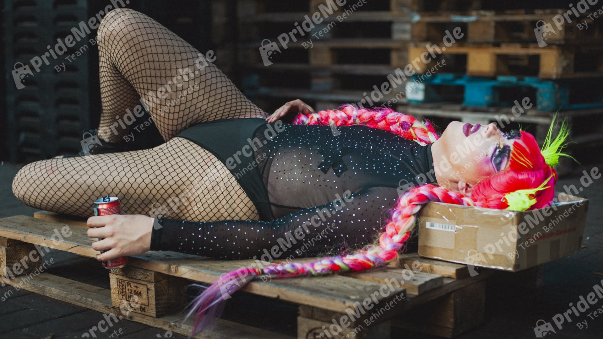 Drag-Performer mit neonpinken Flechtzöpfen, lila Augen-Make-up und schwarzem Mesh-Body in industriellem Umfeld